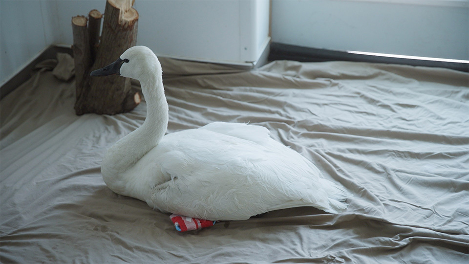 到着したナキハクチョウは、片方の翼に異常があると気づいた女性がセンターまで運んで来てくれました。すぐに受け入れ詳しく診察したところ左の翼に異変が認められました。X線画像で確認したところ肩甲骨と烏口骨の2箇所が骨折していました。回復は困難かもしれませんが不可能ではなさそうです。