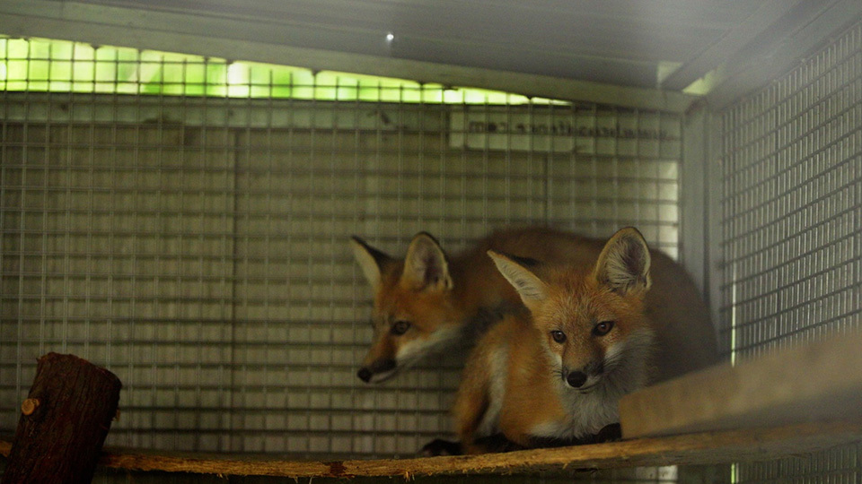 スタッフとボランティアが、数ヵ月前からセンターで暮らしている5匹の子ギツネたちを収容する仮設ケージを設置しています。人がおらず車も入ってくることのない森の中で徐々に野生復帰させるのです。この作業には時間と労力とチームワークが欠かせません。仮設ケージの設営を統括するのはベテランボランティアのジュディです。研究熱心で多くのキツネの世話をしてきた彼女は、この仕事にうってつけです。