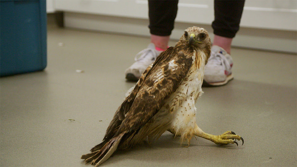 住宅地で横たわったまま動けない猛禽類がいるとの知らせを受け出動したブロンウィンが保護したアカオノスリは、幸い骨は折れておらず抗炎症剤を投与し経過を観察していました。ようやく屋外のケージに移して野生復帰に向けたリハビリの最終段階に入り、自力でエサを取れるかどうかが次の課題です。屋外のケージでしばらく暮らし、この環境に慣れたところで狩りの練習を始める計画ですが困ったことにアカオノスリは一向に飛ぼうとしません。