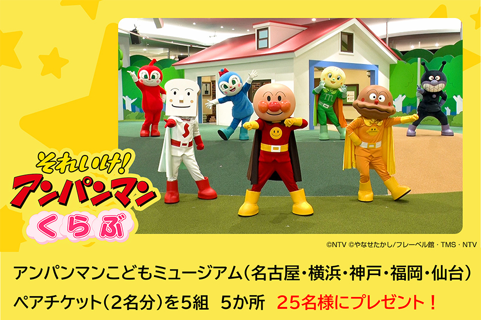 アンパンマンこどもミュージアム(名古屋・横浜・神戸・福岡・仙台)ペアチケット(2名分)を各5組25名様にプレゼント!