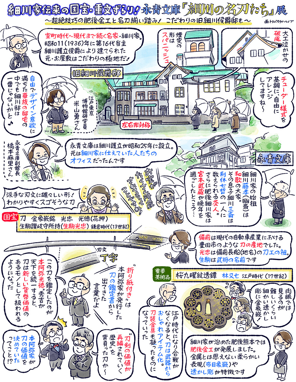 今回のぶらぶらは、東京文京区にある肥後細川庭園からスタート。このあたりは、幕末の頃に熊本藩主細川家の下屋敷となり、明治維新以降は細川家の本宅になりました。現在も、庭園の周辺には細川家の侯爵が住んでいた邸宅や、700年に渡り細川家に代々伝わる美術工芸品を一般公開している美術館「永青文庫」があり、細川家の威光に触れることが出来るんです。ということでぶらぶら一行は、庭園を散策しながら、旧細川侯爵邸へ。昭和11年、第16代当主、細川護立侯爵によって建てられた邸宅は、当時を代表する華族邸宅で、施主のこだわりが、ふんだんに詰まっています。イギリスのチューダー様式や日本の飛鳥時代、鎌倉時代に見られる様式など、様々な建築様式を取り入れ、凝りに凝った邸宅を、ぜひ堪能して下さい。続いて、細川家伝来の美術品を公開している永青文庫へ。永青文庫では、現在「揃い踏み 細川の名刀たちー永青文庫の国宝登場ー」という展覧会が開催中。国宝に指定されている刀剣をはじめ、PCブラウザゲーム・スマホアプリ『刀剣乱舞ONLINE』で注目の刀「歌仙兼定」も登場!さらには、超絶技巧が駆使されている、刀の鐔など刀装金具を鑑賞します。橋本麻里副館長による、日本刀にまつわるうんちくたっぷりの解説でお楽しみください。