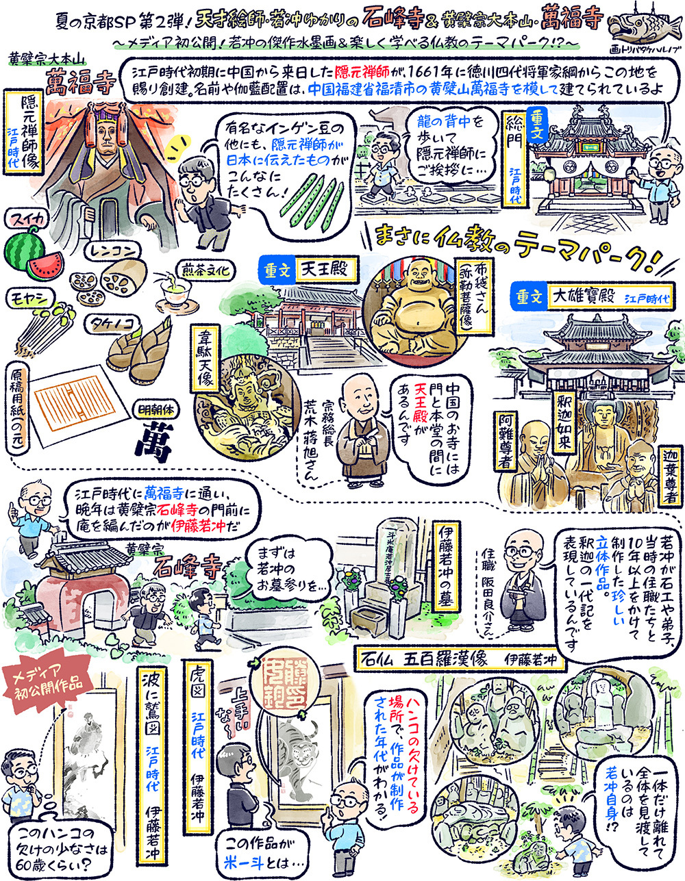 「夏の京都スペシャル」の後編は、黄檗宗大本山萬福寺と天才絵師、若冲が晩年を過ごした石峰寺へ。まずは、京都府宇治市にある日本三大禅宗のひとつ、黄檗宗大本山萬福寺。江戸時代に、中国から来た隠元禅師が開いたお寺だけあって、境内は全てが中国様式と異国情緒たっぷり。アミューズメント感があってまるで仏教のテーマパークのようです。例えば、お経は中国語だったり、境内全体が龍の形を模して造られていたり、扉にはなぜか「桃」の彫刻が施されていたり、七福神で知られる布袋さんがお寺の中心に祀られていたり、仏像が日本のとは違って表情豊かでキャラが濃かったり…。ぶらぶらメンバーは、目の前に現れる疑問をひとつひとつ楽しく探っていきます。さらに、中国の精進料理、普茶料理をぶらぶらメンバーは、初体験します。続いては、京都市伏見区、江戸時代の天才絵師、伊藤若冲が晩年を過ごした石峰寺も訪れます。まずは珍しい若冲の立体作品、石で造った五百羅漢像を鑑賞します。かつては1000体以上あったという五百羅漢像。絵師である若冲は、最晩年になぜ石仏を造ったのか?そして、お寺に伝わる若冲作品も特別に拝見。しかもその中の2作品は、メディア初公開です。若冲が晩年にこだわった魂のこもった水墨画をじっくりと鑑賞します。