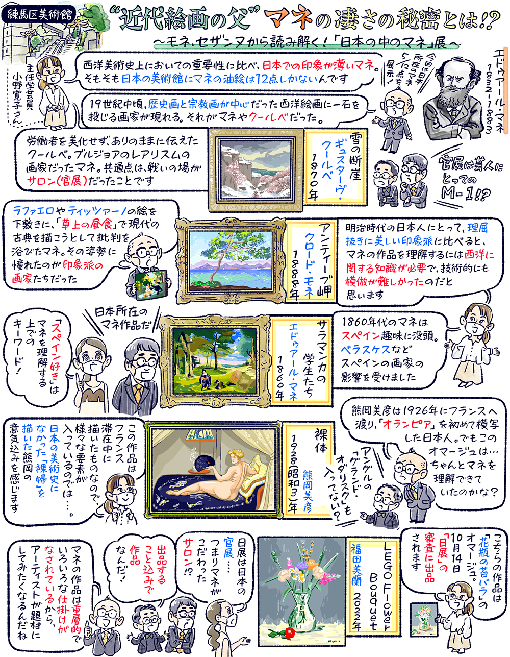 今回は、久々の練馬区立美術館へ!19世紀フランスで活躍した画家エドゥアール・マネを、ユニークな切り口で紹介する展覧会をぶらぶらします。パリの裕福な家に生まれたマネは、伝統的な絵画モチーフを下敷きに、当時はタブーだった同時代の女性のヌードなどを描いた「草上の昼食」や「オランピア」をサロンに出品し、度々スキャンダルを巻き起こします。世間からの反発に屈せず、独自の絵画世界でサロンに挑み続けたマネ。彼を慕う、モネやルノワールら若手画家たちは、マネのアトリエ近くのカフェに集い、後に「印象派展」と呼ばれるグループ展を開催するに至ります。そんな“近代絵画の父”ともされるマネですが、なぜか日本でのイメージは弱く、印象派と比べると開催された個展も数えるほど。その理由が一体どこにあるのかを、日本にあるマネ作品を中心に、マネから強い影響を受けたモネやセザンヌ、そして日本の洋画家らが、マネを手本に描いた力作などから読み解きます。 さらに、日本を代表する現代美術家、森村泰昌と福田美蘭によるマネ・オマージュ作品も一堂に。時代を超えて、アーティストに刺激を与え続ける、巨匠マネの真の凄さと、その作品の魅力に徹底的に迫ります。