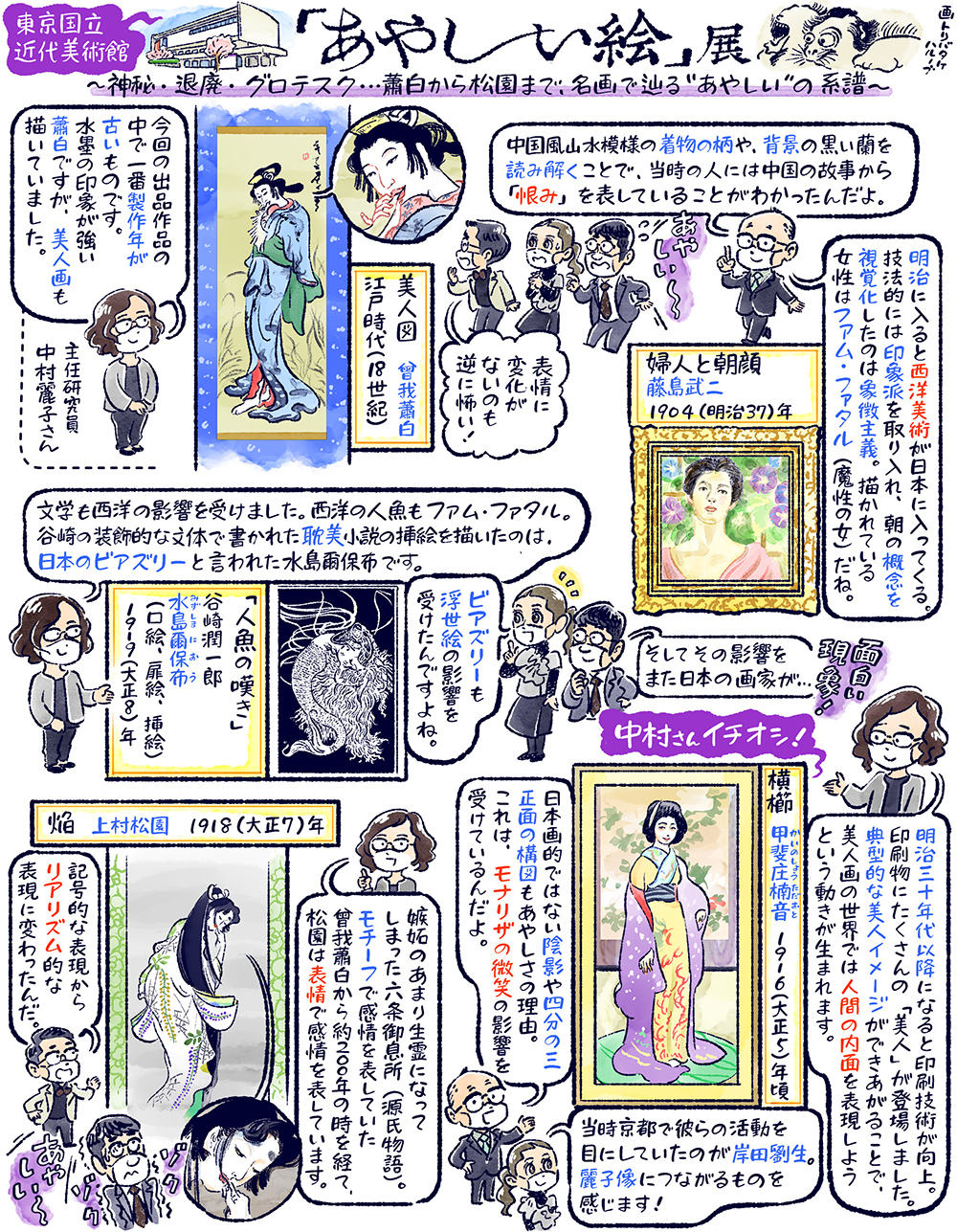 今回は、竹橋の東京国立近代美術館で開催中の「あやしい絵」展へ。幕末から昭和初期にかけて作られた、様々な”あやしい”魅力の詰まった絵画や版画、挿絵など、約160点を集めたユニークな展覧会です。