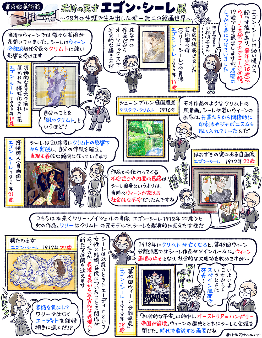 今回は、20世紀初頭のウィーンで活躍した画家エゴン・シーレの、日本で約30年ぶりとなる展覧会へ!自らの内面をえぐるような自画像など、型破りな表現を確立、現在も熱烈な支持を集め続けるシーレ。ミュージシャンの故デヴィッド・ボウイや、漫画家の荒木飛呂彦も、シーレからの影響を受けていると言われています。1890年に生まれ、当時最年少の16歳でウィーン美術アカデミーに合格したシーレは、革新的な芸術運動を先導する画家グスタフ・クリムトと出会った事で、保守的なアカデミーと決別し、独自の絵画表現を探求し始めます。クリムトの装飾的な画風や、ヨーロッパの様々な近代絵画を吸収したシーレは、やがて人間の内面の苦悩や不安を感じさせる、表現主義的な独自の画風を生み出します。中でも、熱心に取り組んだ自画像は、28年の短い人生でなんと100点を超えます。忍び寄る戦争の足音の中、シーレが鏡の奥に見つめ続けたものとは、一体何だったのか?今回は世界最大のシーレ・コレクションとして知られるウィーンのレオポルド美術館から、約50点の作品が来日。“悲劇の画家”のイメージが強いエゴン・シーレの、知られざる生涯とともに、その独特な絵画世界の魅力を紐解きます。