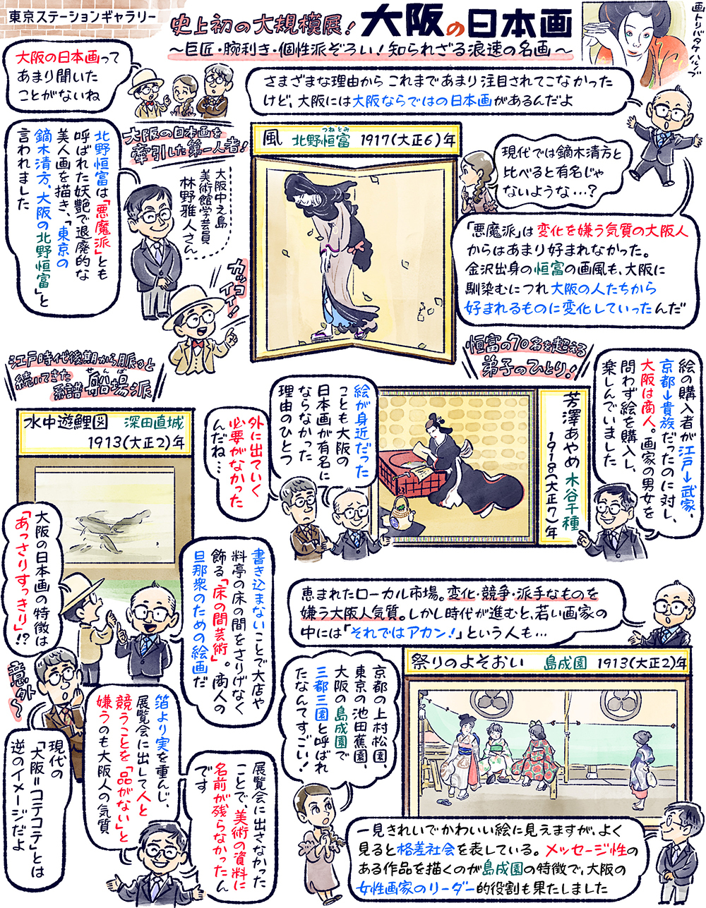 今回は、東京駅周辺をぶらぶら。まずは、丸の内仲通りのオフィス街にあるパブリックアートを鑑賞します。三菱地所と彫刻の森芸術文化財団が街づくりの一環として行っている「丸の内ストリートギャラリー」。舟越桂さんや中谷ミチコさんなど、パブリックアートならではのユニークな彫刻作品を楽しみます。そして、東京ステーションギャラリー「大阪の日本画」展へ。近代大阪で活躍した50人以上の画家の作品が集結し、網羅的に紹介する史上初の大規模展です。妖艶な作風で「悪魔派」と呼ばれた北野恒富や、女性画家の先駆者で上村松園とも並び称された島成園。それらの巨匠作品をはじめ、個性的な人物画や賑やかな風俗画などが登場します。しかし現在では、大阪の日本画はほとんど知られていません。一体なぜなのか…?そこには、大阪の画家とパトロンとの関係や、大阪の人の気質など様々な理由があったのです。「残された最後の研究領域」とも言われる大阪の日本画の世界を、ぜひご一緒に。
