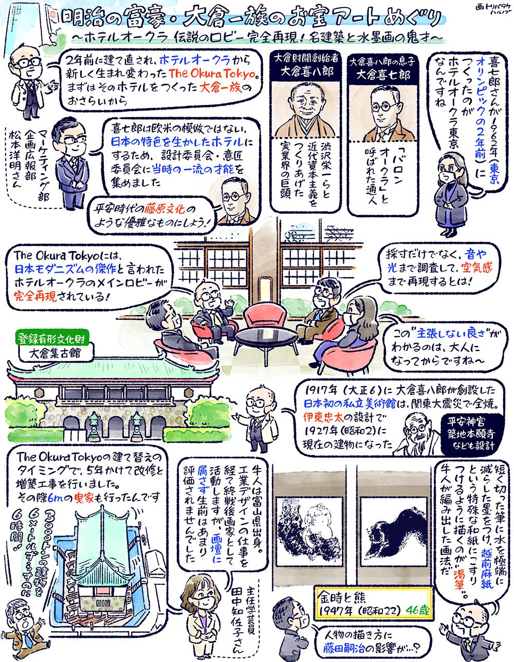 そして、The Okura Tokyoの前にある大倉一族のお宝を収蔵する美術館「大倉集古館」へ。建築界の巨匠・伊東忠太が設計した、まるで中国のお城のような本館。屋根に乗っている変な怪物の正体など、伊東忠太色満載の名建築を堪能します。さらに、ホテル建設と同時期に5年間の改修工事を実施。その時に行った珍しい「曳家」の模様も解説。 そして、開催中の展覧会、今話題の昭和の水墨画家「篁牛人」展へ。篁牛人は、富山県出身の孤高の画家。一風変わった水墨画のスタイルは、渇いた筆で墨を和紙に擦り込むようにして描く、牛人独自の手法「渇筆画」(かっぴつが)と言われるもの。水墨画でありながら、藤田嗣治、ピカソ、ルソー、漫画の画風を取り込もうと、さまざまな挑戦をし続けた昭和水墨画の鬼才の作品を堪能します。