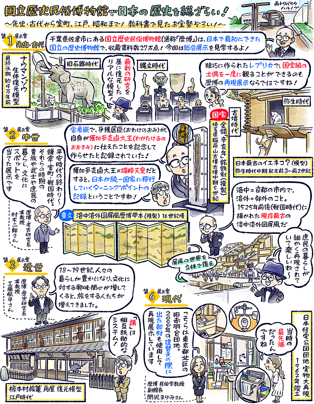 今回は、千葉県佐倉市にある佐倉城址公園から、スタート!佐倉城は、関東の名族・千葉氏が中世に設けた城を、江戸時代に老中・土井利勝が作り替えて完成させたという「土づくり」の城。その城跡を利用した佐倉城址公園は、東京ドーム約5個分の広さを誇ります。園内には今も、天守閣や門の跡、空壕などの遺構が残り、千葉県で唯一「日本100名城」にも選定されています。続いて一行は、公園の一画に位置する、国立歴史民俗博物館・通称「歴博」を初訪問!1983年にオープンした歴博は、日本の歴史と文化を総合的に研究し、その成果を展示・公開している、日本で最初に出来た国立の歴史博物館。常設の「総合展示」では、先史時代から現代に至るまでの、4万年に渡る列島の歴史や民俗文化の流れを、6つのテーマに分けた展示室を通して学ぶ事が出来ます。中でも注目は、歴博が所蔵する「洛中洛外図屏風」に描かれた、室町時代の京都の町並みを立体で再現した巨大模型。研究に基づき精密に再現された模型からは、当時の京都にタイムスリップした気分も味わえます。さらに徳川家康が発行した朱印状や、朱印船の復元模型、旧赤羽台団地の実物大再現など、歴史好きはもちろん、大人も子供も1日丸ごと楽しめる、壮大なスケールの博物館を堪能します!