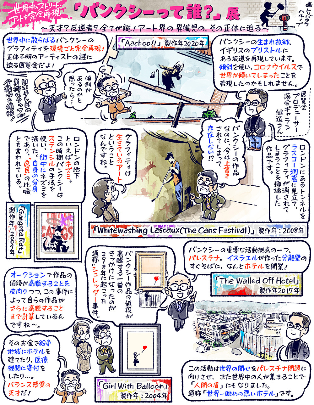 今回のぶらぶらは、東京・天王洲アイルの寺田倉庫G1ビルで開催中の「バンクシーって誰?」展へ!世界のストリート・アートの最前線を突っ走るアーティスト、バンクシー。2018年、オークションで、自らの作品が1億5,000万円で落札された瞬間、額に仕込んだシュレッダーで作品を切り刻み、世界中で話題となりました。日本では、港区でバンクシー作品と思われるネズミの絵が発見されると、小池都知事が“カワイイねずみ”とS N S投稿、バンクシーという名前が、日本中に知れ渡りました。そんなバンクシーですが、プロフィールは明かされておらず、本名も顔も一切“謎”という、覆面アーティストでもあります。今回の展覧会は、バンクシーが、世界中のストリートに残してきた数々の傑作を、なんと、街並みごと、再現展示!その作品世界を原寸大で体感し、バンクシーの“謎”に少しでも迫ろうという試みです。さらにプライベート・コレクター秘蔵のオリジナル作品も展示!イギリスのファッション・デザイナー、ポール・スミス氏が所蔵する油彩画も本邦初公開!アート界の異端児は、“天才”なのか、それとも“反逆者”なのか?彼は一体“何者”で、何が“すごい”のか? その答えを、じっくり紐解いていきます。