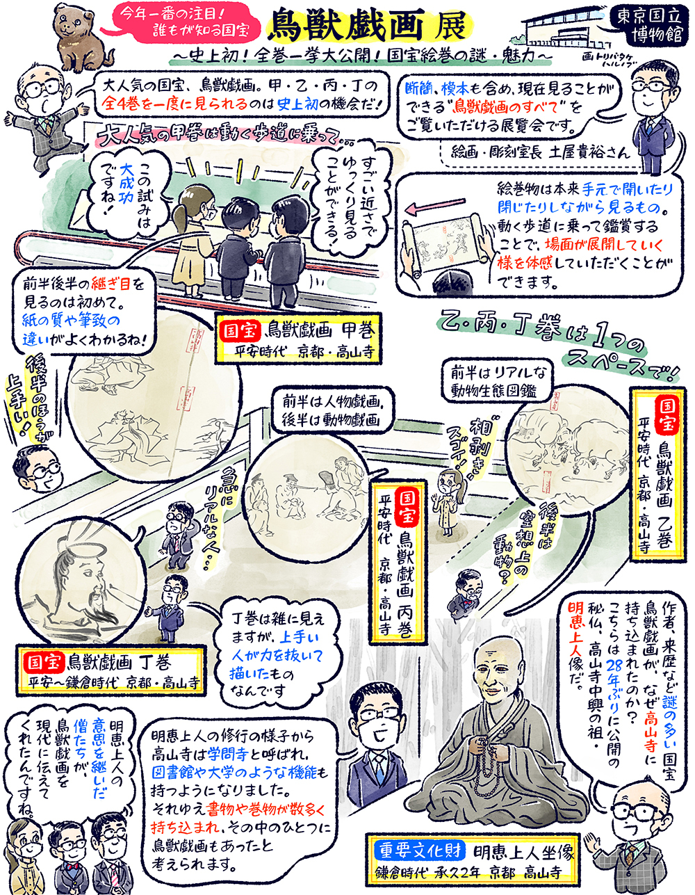 今回のぶらぶらは、上野の東京国立博物館で今年、大注目の展覧会「国宝 鳥獣戯画のすべて」を堪能します。京都・高山寺に伝わる日本一有名な絵巻、国宝「鳥獣戯画」は、擬人化した動物や人々の営みを墨一色で躍動的に描いた作品。今回、史上初めて、甲・乙・丙・丁全4巻の全場面を、一挙大公開しているのです。あの「ウサギとカエルの相撲」で知られる「甲巻」は、“動く歩道”に乗って鑑賞するということでも話題です。そして“動物図鑑”とも言える「乙巻」は、麒麟や龍など、空想上の霊獣が勢揃い!人物戯画が描かれる「丙巻」は、後半になると動物戯画にガラリと変わってしまう…そのことが、「鳥獣戯画」における大きな謎の一つでした。しかし、本格修理によって理由が解明されつつあるのです。その新事実とは?そして、ラフすぎる筆致で、一番の問題作でもある「丁巻」。一見、あまり上手に見えない「丁巻」ですが、実はあるポイントを見ると、描き手の巧さがよくわかるんです。そのポイントを解説します。さらに!今回は、高山寺を興した明恵上人のお宝も続々!実に28年ぶりに公開される“秘仏”「明恵上人坐像」や、重要文化財史上、最も可愛い「子犬」も登場。明恵上人の“精神”を理解する事で、何倍も楽しくなる「鳥獣戯画」。その魅力を徹底解説する1時間です。