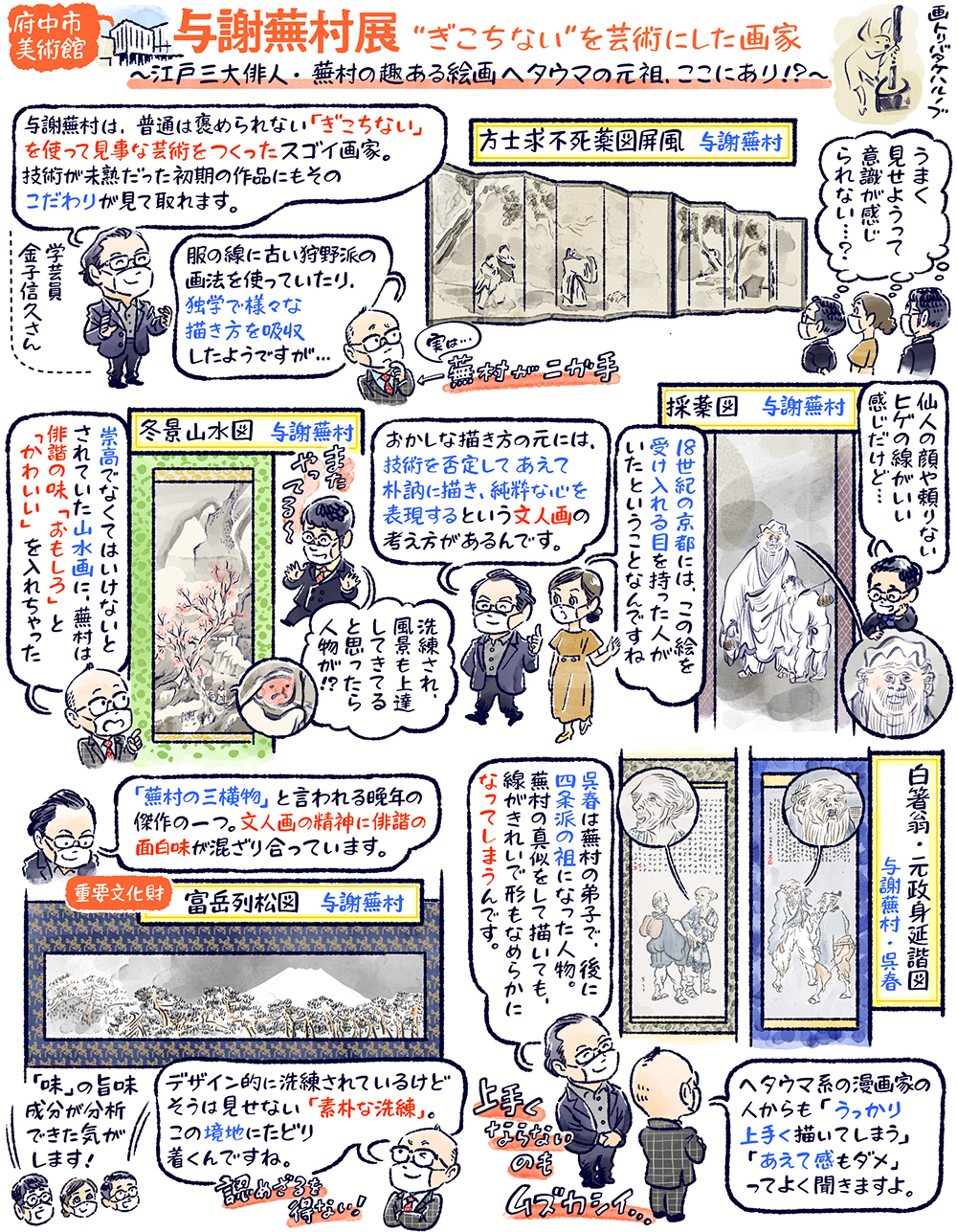 そして、アート散歩をしながら向かったのは、府中市美術館。今、こちらで、ちょっと変わった「与謝蕪村」展が開催中。テーマは、「『ぎこちない』を芸術にした画家」。俳画家として有名な蕪村ですが、描かれる線はどこか頼りなく、「ぎこちない」「拙い」と言われることもしばしば。ちょっと気持ち悪い老人の絵や、体のバランスがおかしい鹿の絵など、確かにツッコミどころが満載!それってつまり、ヘタってこと・・・?なんて思うかもしれませんが、実はそんなことはありません!じっくり見ていると、蕪村が生涯貫いた「ぎこちなさ」へのこだわりが見えてきます。これは天然なのか、演出なのか!?あなたは、どう見る?