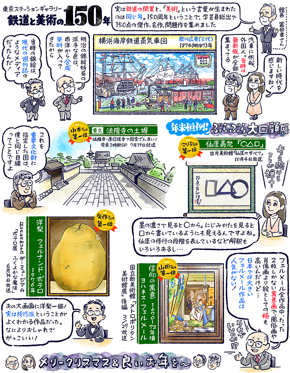 今回は、2022年の締めくくり!まずは東京ステーションギャラリーで、日本の鉄道開業150周年を記念した展覧会「鉄道と美術の150年」を楽しみます。明治5年、新橋・横浜間で開業した鉄道は、その後 発展を続け、明治22年には東海道線が開通、昭和に入る頃には日本全国にまで拡張されました。開業当初は物珍しさから、多くの錦絵のモチーフとなりますが、運賃が高く、乗車出来たのは一握りの人だけ。やがて鉄道が、一般の人々にとっても身近なインフラとなっていく中、画家たちも日常の画題として、鉄道を様々な形で描くようになります。今回は鉄道150周年に合わせて、錦絵から洋画、写真、ポスター、現代アートに至るまで、鉄道にまつわる作品150件を一堂に集めた渾身の企画展。バラエティ豊かな作品を通して、鉄道150年の軌跡を辿ります。そして一行は、東京駅から歩いて10分、大手町のオフィス街のど真ん中にある温泉旅館「星のや 東京」で年末恒例の大回顧展を開催します!2022年、ぶらぶらメンバーの心を捉えた作品とは?山田五郎、おぎやはぎ、高橋マリ子がベスト5を発表。名作、傑作、国宝をもう一度!今年一年のアートを、楽しく振り返ります。ぜひご一緒に!
