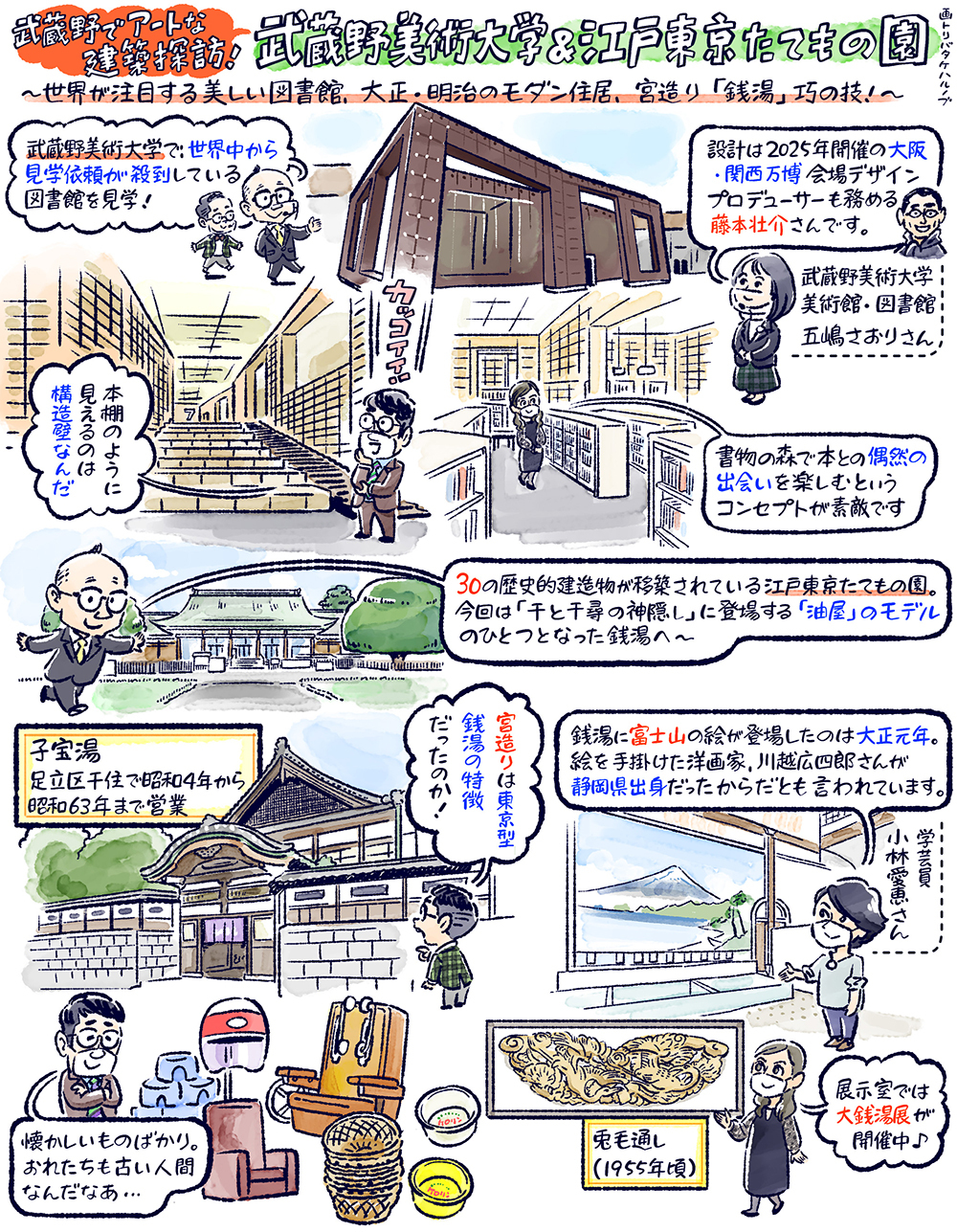 武蔵野美術大学、通称“ムサビ”からスタート。世界中から見学依頼が殺到している注目の建物、武蔵野美術大学 美術館・図書館を見学。美術館と図書館が一体化した建物で図書館は建物全体がガラス張り、館内に入れば、「森」をイメージした巨大本棚!でも、本があまり入っていない!?その秘密を伺います。