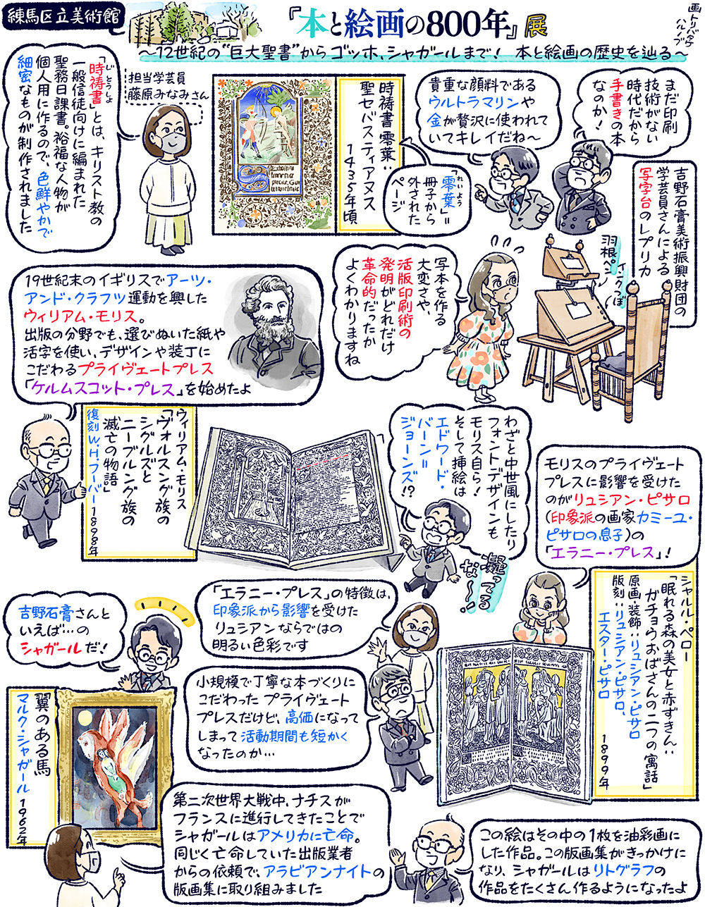 今回は、練馬区立美術館で開催中の「本と絵画の800年」展を鑑賞します。吉野石膏所蔵の絵画コレクションと、吉野石膏美術振興財団のアートライブラリーが有するヨーロッパの貴重書を、同時に楽しむ事が出来る初めての機会です。注目は、活版印刷が生まれる以前、写字生らの手によって写された彩色写本の数々。中には12世紀イタリアで作られた「巨大聖書」の一部や、金よりも高価だったというウルトラマリン の顔料を惜しげもなく使った豪華な「時祷書」など、滅多に観られない貴重な品々も。また、印象派の画家カミーユ・ピサロの息子リュシアンが設立した印刷工房エラニー・プレス から出版された、美しい本の数々も一堂に。さらに、ルノワールやゴッホ、シャガールを始めとする西洋画家や、渡辺省亭、上村松園といった人気日本画家の作品など、本と絵画の結びつきに注目して選ばれた約200点の作品を一挙公開。12世紀の写本から近代の絵画まで、800年に渡る本と絵画の関係を紐解く、ユニークな切り口の展覧会です。