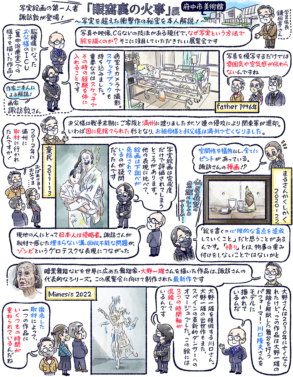 今回は、府中市美術館で開催中の「諏訪敦『眼窩裏の火事』」展へ。諏訪敦さんは、写実絵画の第一人者で、緻密でリアルな作品を描く画家として知られています。しかしその作品を紐解いていくと、単なる写実というジャンルを超えた絵画であるということが分かります。今回は、諏訪敦さんご本人が登場!制作秘話やエピソードをたっぷり解説していただきます。「HARBIN 1945 WINTER」は、満州に渡り難民収容所で亡くなった諏訪さんのおばあさんを題材にした作品。病気で痩せ細った老婆の亡骸が描かれていますが、実はこの絵の下には、健康な女性の姿が描かれていると言います。その知られざる制作過程とは…?そしてコロナ禍で取り組んだという静物画には、仙厓義梵の禅画のオマージュ作品も。諏訪さんが考える「悟り」とはどういう状態なのか、それをどうやって絵にするのかが見えてきます。過剰ともいえる膨大な取材によって作品を描き上げる諏訪さん。話を聞くと、画家がどうやって作品を作るのか、対象とどう向き合っているのか、さらには人の死とは何なのか…様々なことを考えさせられます。普段とはひと味違う濃密な絵画鑑賞を、ぜひご一緒に。