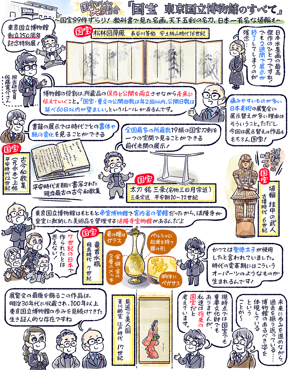 今回は、今年最も注目されている展覧会のひとつ、東京・上野の東京国立博物館で開催中の「国宝 東京国立博物館のすべて」展へ!東博創立150年を記念して、所蔵する国宝89件すべてを展示するという、東博史上初の展覧会なのです。長谷川等伯の「松林図屏風」をはじめ、現存最古の古今和歌集、日本一有名な埴輪など、教科書で見た有名作品ばかりが並びます。また、国宝の日本刀19振をこだわりの照明で展示した刀剣ルームも。刀剣乱舞でおなじみ、天下五剣の名刀「三日月宗近」は圧巻の佇まいです。さらに、東博150年の歴史を振り返る特別展示も。東博の起点となる1872年の「湯島聖堂博覧会」の再現展示から、最新の所蔵品としてはじめて展示する「金剛力士立像」などを拝見。展示室の中には、なぜかキリンの剥製も・・・東博との意外な関係とは?滅多に見られないこの機会、東博のすべてを見られる1時間!ぜひ、ご一緒に。