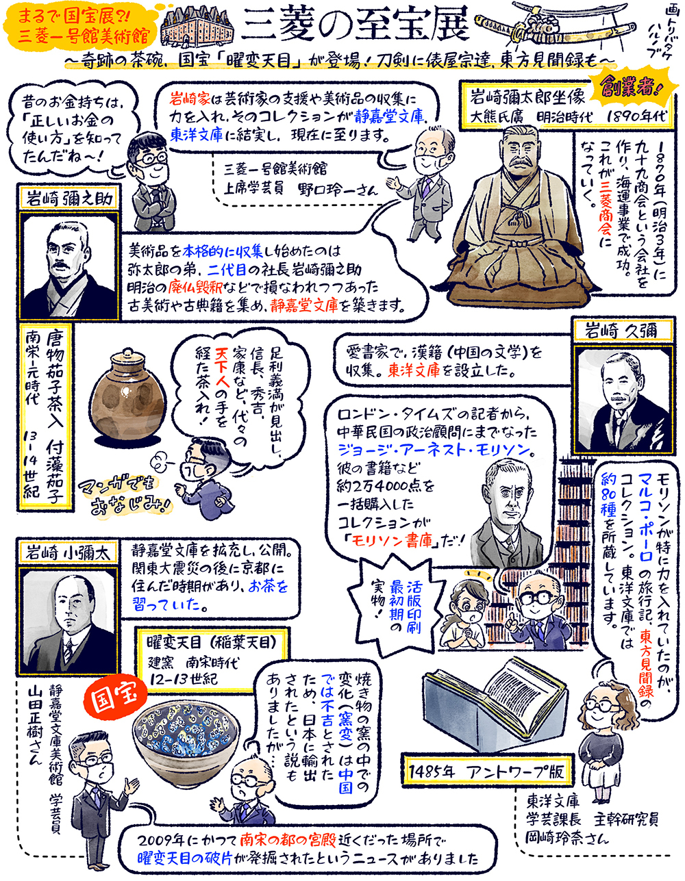 今回のぶらぶらは三菱一号館美術館「三菱の至宝展」へ。創業150周年を記念して、三菱の歴代社長が集めた国宝12点、重要文化財31点など約100点の至宝が一堂に会する展覧会です。その珠玉のコレクションは、国宝の刀剣や、司馬遷の「史記」など、教科書にも載るような作品ばかり。中でもぶらぶらメンバーが驚いたのは、あのマルコ・ポーロの「東方見聞録」!日本について書かれた、かの有名な「黄金の国ジパング」に、興味津々!また、俵屋宗達の晩年の傑作である国宝「源氏物語関屋澪標図屏風」は、あの京都・醍醐寺から贈られた物だったのです。その理由とは一体?三菱創業者である岩崎家が作品を手に入れ、静嘉堂文庫や東洋文庫などを形作っていった、蒐集と文化貢献への歴史も紐解きます。そして注目は、奇跡の茶碗と言われる国宝「曜変天目」。世界にたった3点しか存在しない、超貴重な茶碗です。「てのひらの宇宙」と言われる不思議な光彩、文様は、どのようにして誕生したのか?3点の曜変天目が全て日本にあるワケとは?死ぬまでに見たい、奇跡の至宝の数々に出会うまたとないチャンス、ぜひご一緒に!