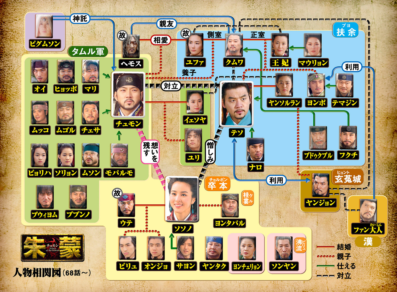 紀元前108年、漢の侵略により古朝鮮国が滅亡する。国を失った流民たちを率いて漢に抵抗する民族の英雄ヘモス(解慕漱)は漢軍との闘いで重傷を負い、河 伯(ハベク)族の娘ユファ(柳花)に救われる。やがてふたりは恋に落ち、ユファはヘモスの子を身ごもるが、それを知る間もなくヘモスは漢軍の矢に倒れてし まう。愛する人を失った悲しみの中、ユファはヘモスの親友で扶余(プヨ)の太子クムワ(金蛙)に保護されて男児を出産し、チュモン(朱蒙)と名付ける。心 ひそかにユファを思うクムワは彼女を側室に迎え、友の忘れ形見チュモンにあきれながら、ソソノはなぜか彼のことが心に残る。その後、兄たちの策略でついに 宮中を追放されてしまったチュモンは、実父ヘモスであるとも知らず偶然出会った盲目の男性から武芸を学び、強く生まれ変わっていく。