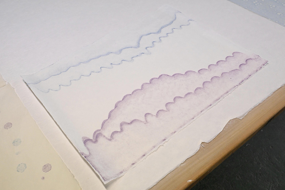 「漉き掛け」とは、漉いた地紙の上に別の紙料を重ねて漉いて模様にする技法のこと。