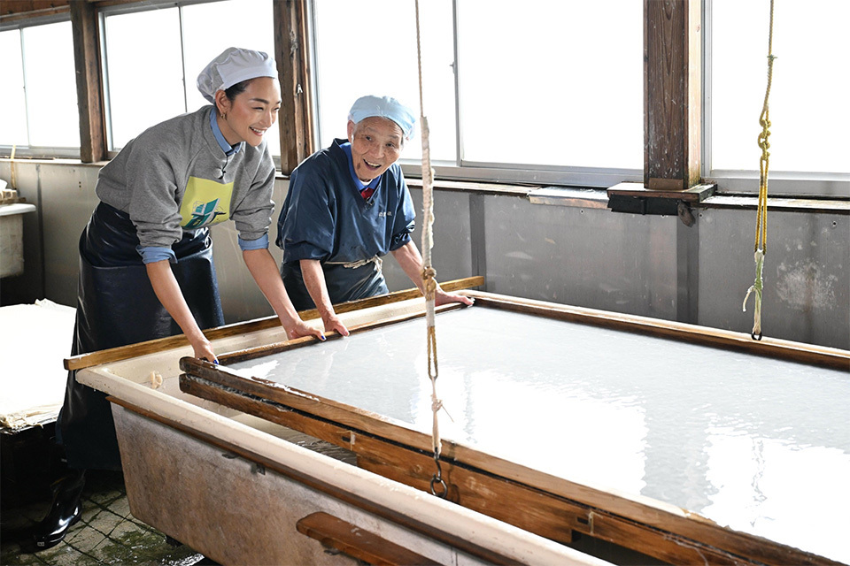 さらに愛さんが名人に教わりながら「紙漉き」に挑戦!