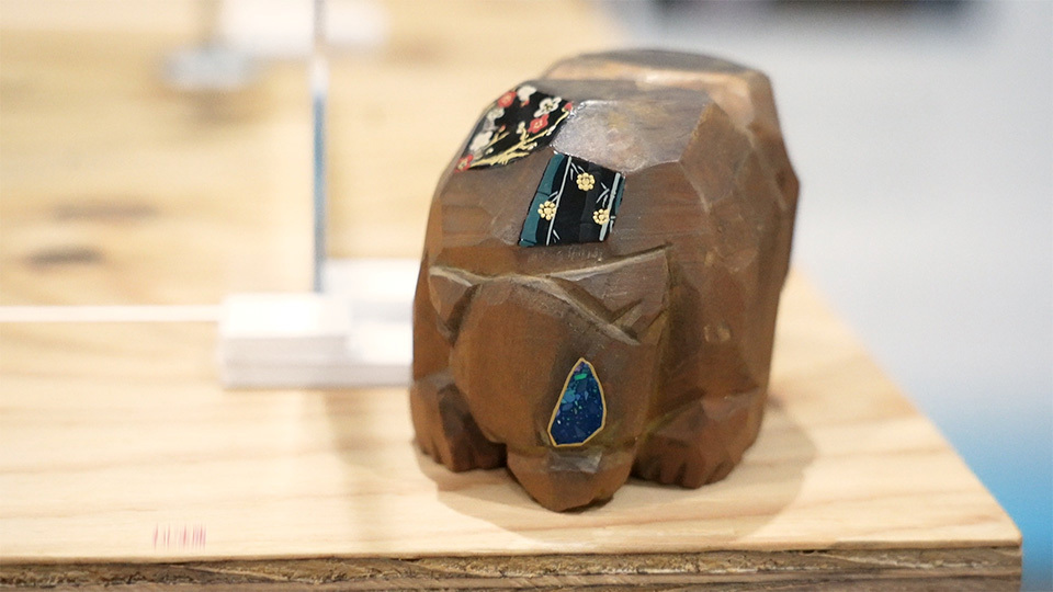 輪島塗の蒔絵師、大森晴香さんは北海道八雲町の木彫り熊職人とコラボし「わじま熊」を制作。