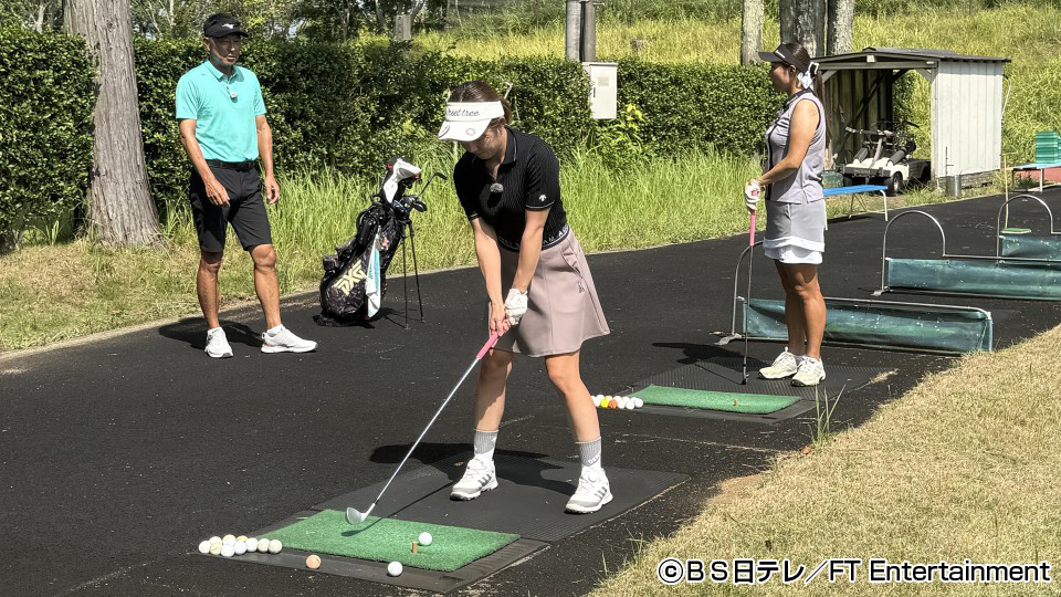 練習場では安定したショットを打っていたが、小林プロからもっとダイナミックに体を動かして、ショットすることをアドバイスされ、飛距離も球筋もしっかりとした風に負けない球が出るようになり笑顔を見せる。