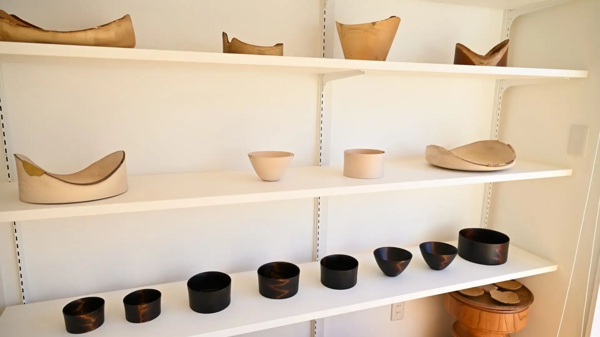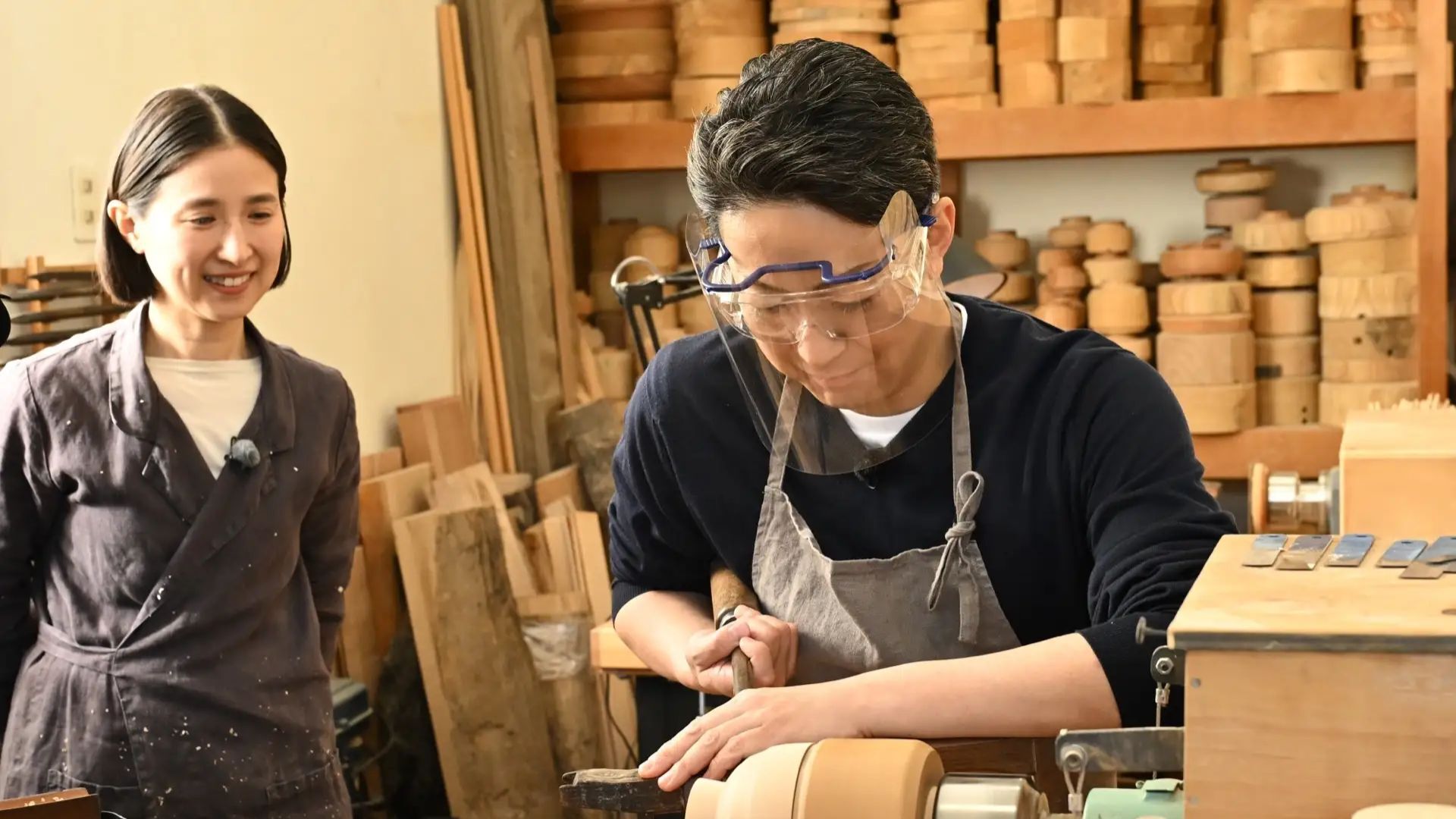 最初に訪れたのは、木地師・山田マコさんの工房。山中漆器の特徴のひとつ、輪切りにした丸太の断面から形を木取りする「縦木取り」という技法を見学した。さらにノミを振動させて模様をつける「ビリ筋」に挑戦。果たして菊五郎さんの腕前は!?