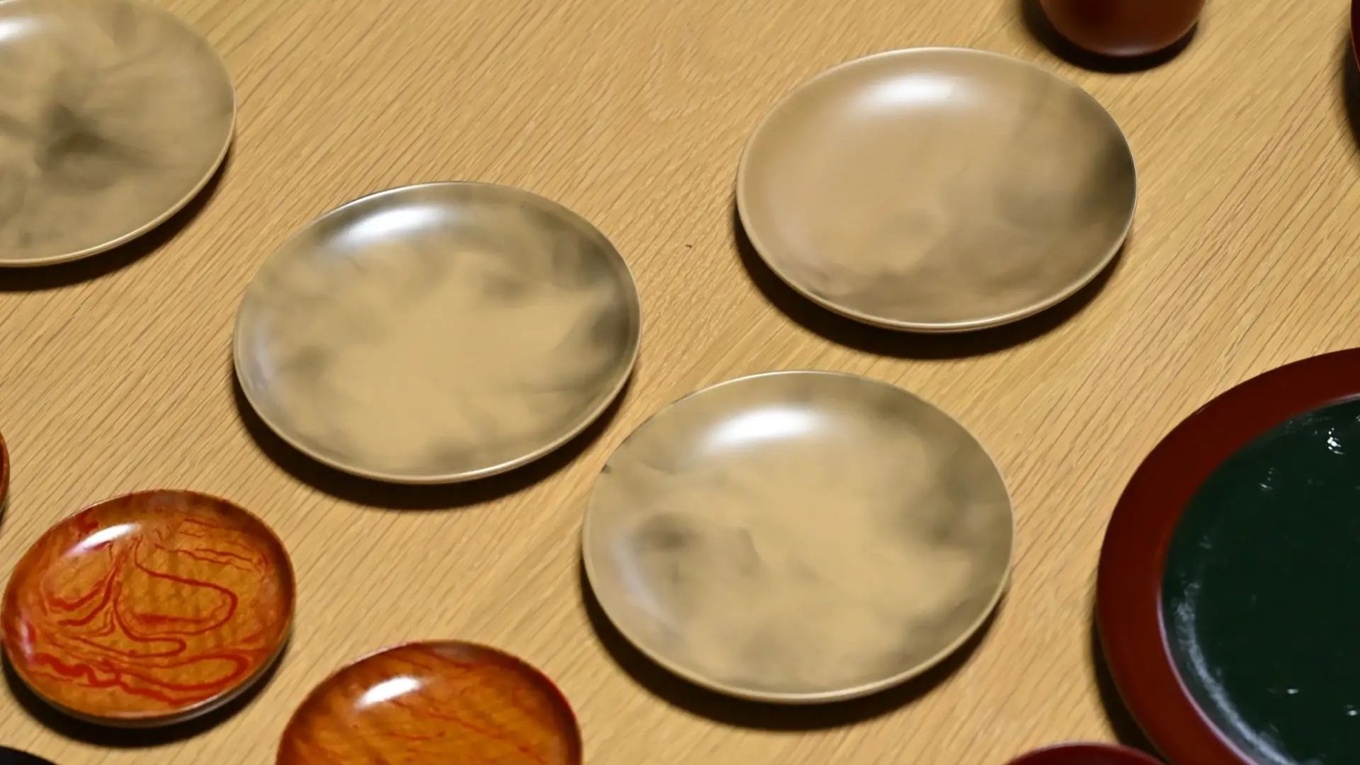 続いて訪れたのは、塗師の清水一人さんの工房。山中漆器の伝統技法「変わり塗り」の作品を拝見しながら、漆が乾く前にロウソクの火であぶり、煤で模様をつける「叢雲塗」に挑戦した。菊五郎さんの真剣な表情は、まさに「歌舞伎の見得」!? その出来栄えは!?