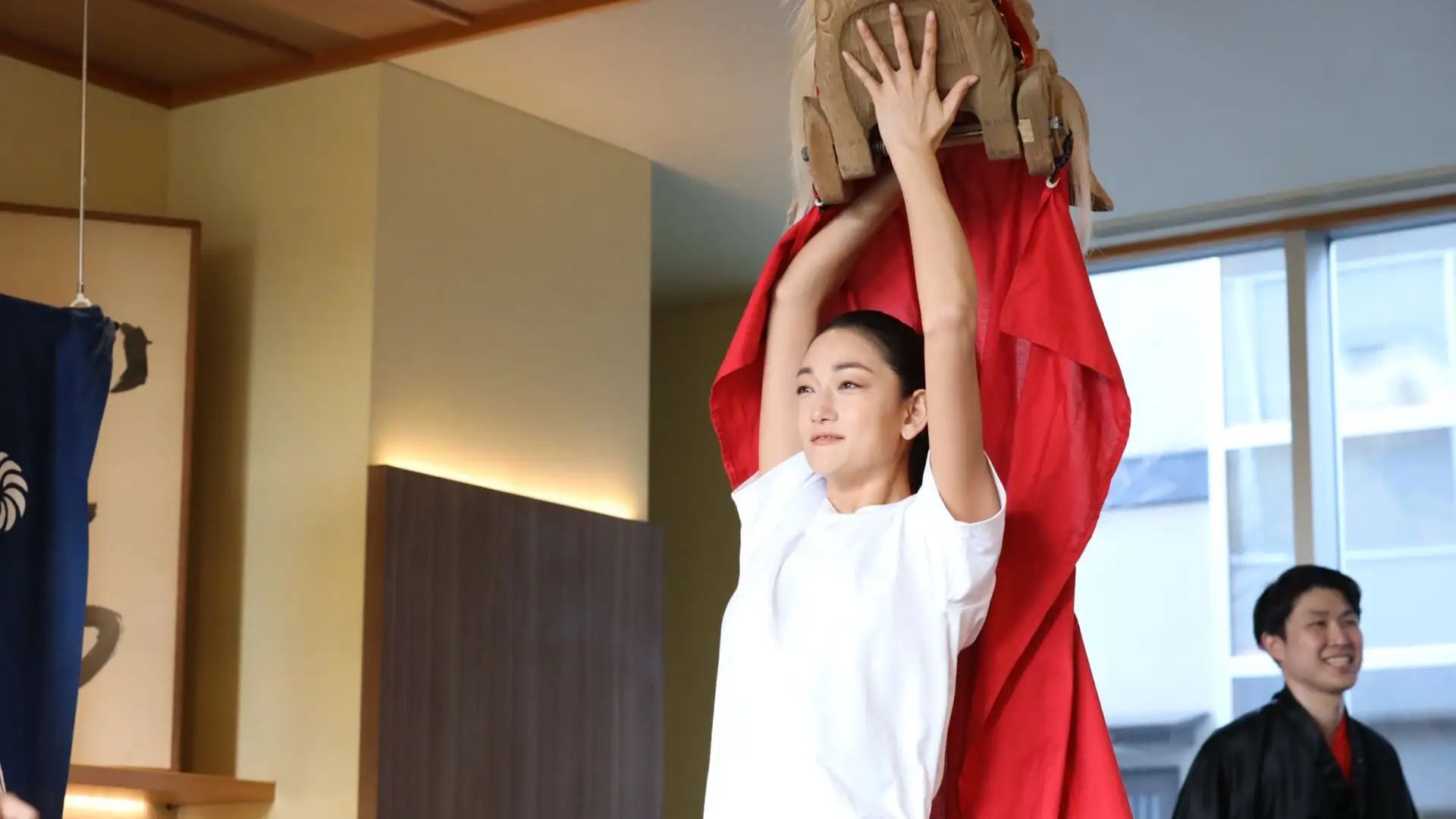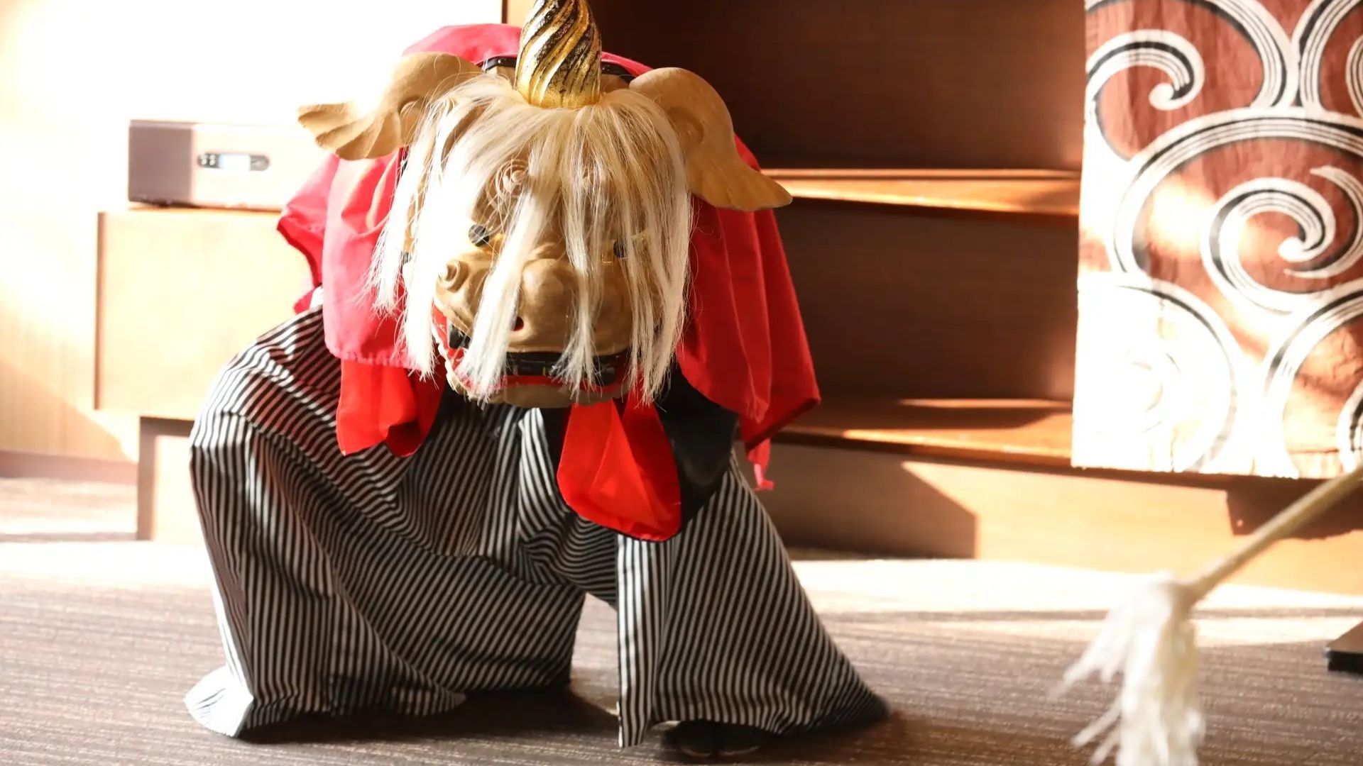 知田工房で作った加賀獅子頭を使った加賀獅子舞が、加賀市にある温泉旅館「界 加賀」で毎日見られるということで行ってみることに。界 加賀ではホテルの従業員が保存会の方達に加賀獅子舞を習い、毎日披露している。400年以上の歴史を持つ加賀獅子舞の特徴は、長い棒を持って獅子に立ち向かう「棒振り」がいること。獅子を倒す様子を悪霊に見せることで、退散させるのだという。
