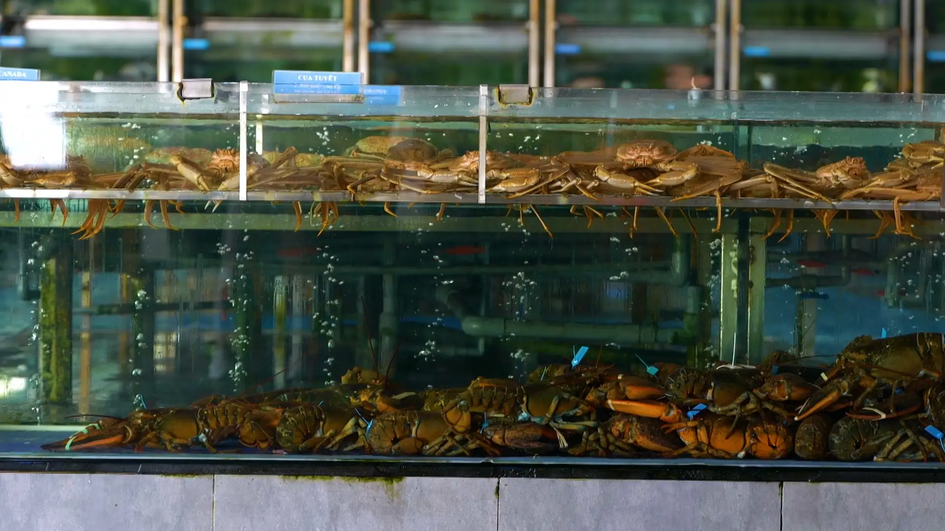 ずらっと並んだ生簀にはカニ、エビ、アワビなど…様々な種類が!
