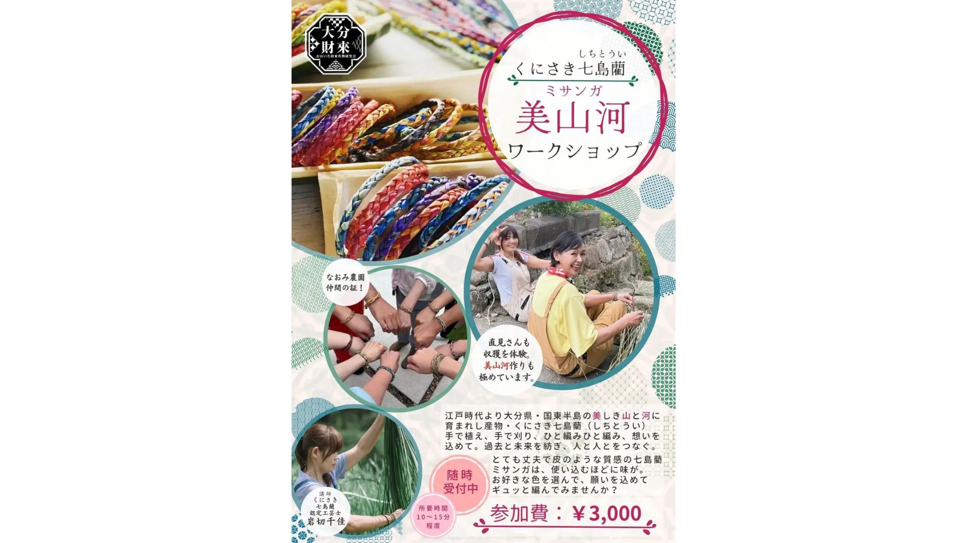 国東地方でしか栽培されない希少な藺草「七島藺」。栽培から制作まで手掛ける工芸作家・岩切チカ氏を講師に迎え、自分だけのミサンガ作りを体験できます。