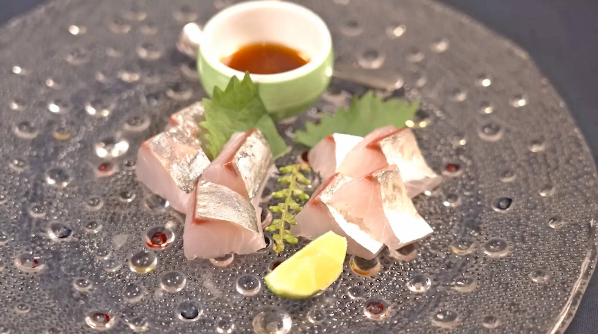 入店してまず竹鶴ピュアモルトのソーダ割りを注文。それに合わせて注文したのは、天然の尺真鯵。三種類をブレンドした刺身用の塩と、いろいろな柑橘をブレンドしたポン酢でいただく。