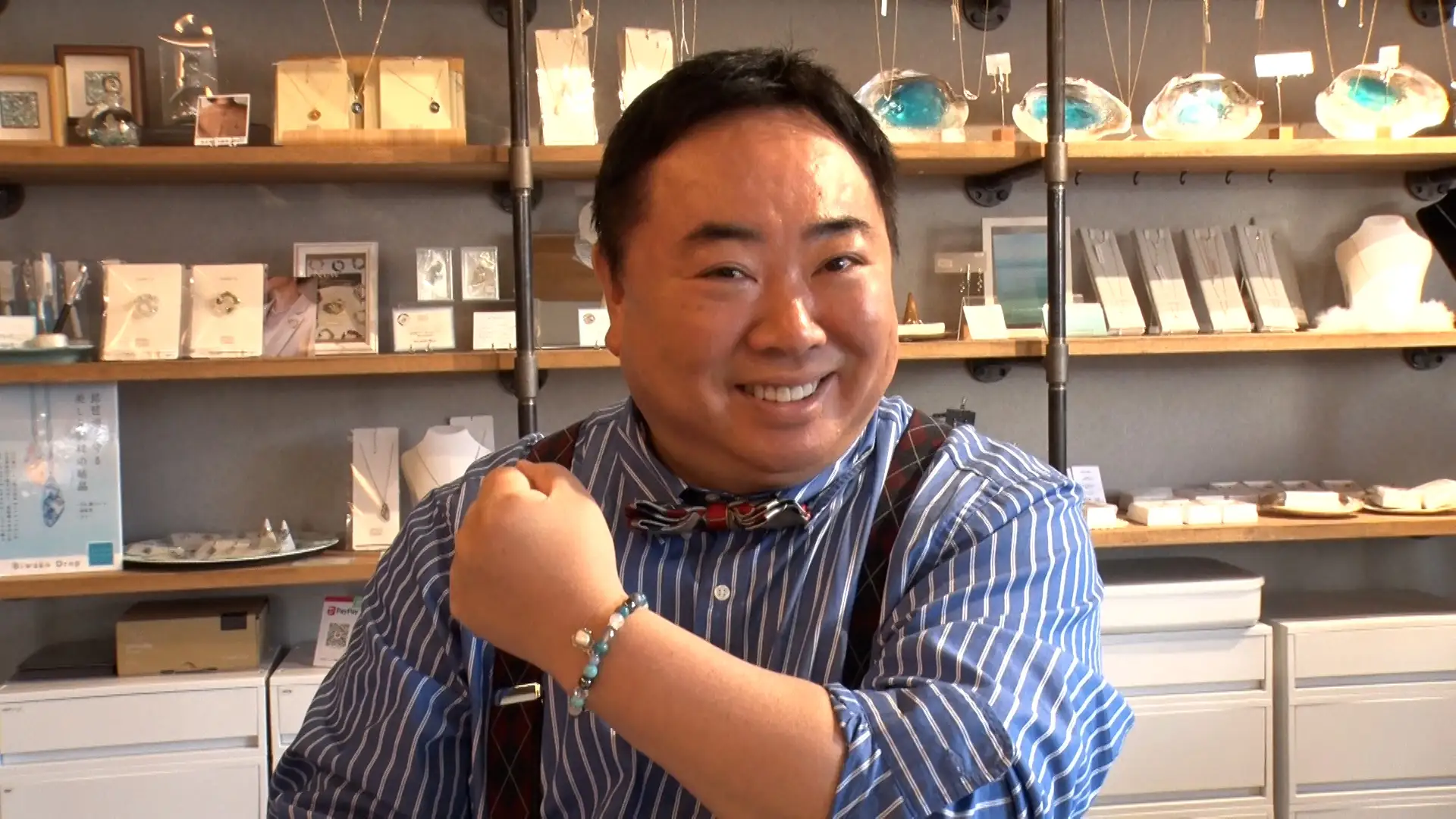 続いて向かったのは、びわ湖パールのアクセサリーを販売する「ビワコパールサプライズアンテナショップ」。琵琶湖で獲れる淡水真珠の魅力を発信するショップで、塚地はブレスレット作りを体験。