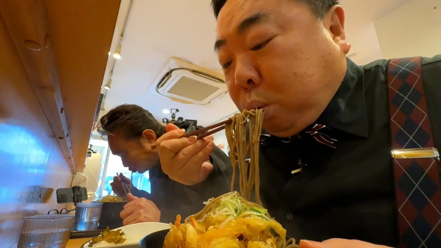 塚地と船越が注文したのは、店一番人気の「特大かき揚げそば」。 国産玉ねぎをたっぷり使用し、“トロっ、シャキっ”とした食感が絶品のかき揚げはボリューム満点!