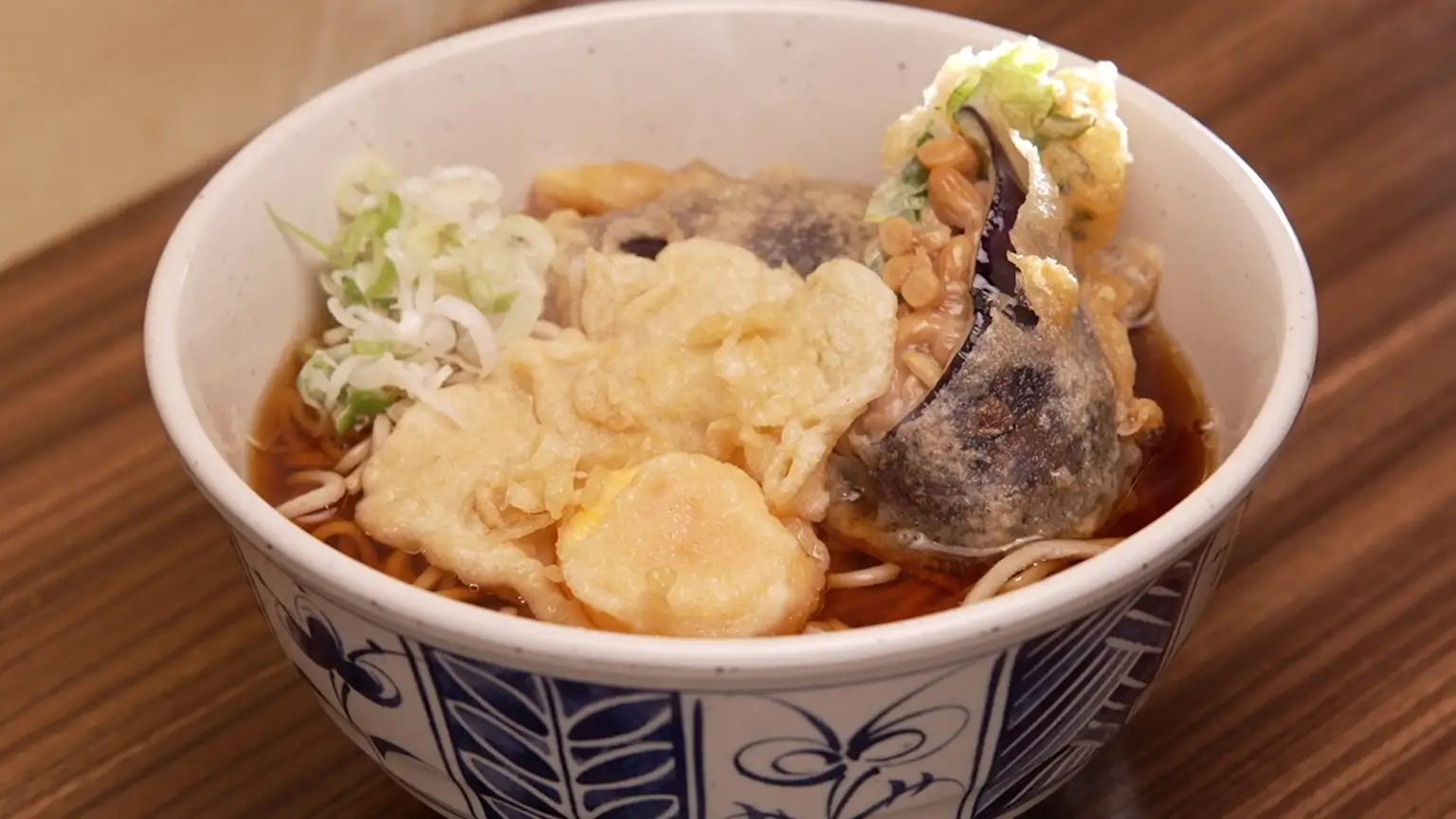 番組では玉子天(130円)とナス納豆天(330円)を、かけそば(350円)にトッピング。