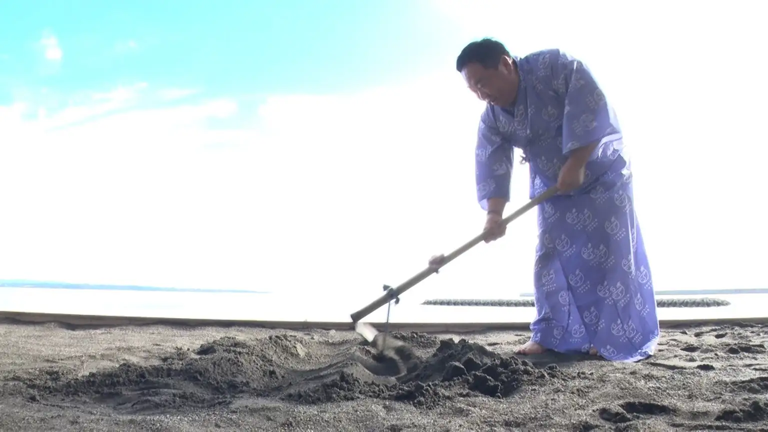 別府湾の海岸沿いをふらっと散策すると別府名物の海浜砂湯を見つける。早速、砂湯に入るため浴衣に着替える塚地だったが、その姿はまるで力士!?
