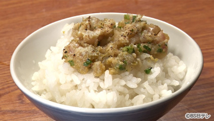 - 2のどぐろを6~7mm角に切り、南蛮味噌と青ネギを和えて軽くたたく。バットに広げて、表面をバーナーであぶり香ばしくする。