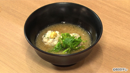②のすり身を丸めて鍋に入れる。3分煮たら味噌を溶き入れ、菜の花を戻し入れ火を止める。 - 5器につみれ2個と菜の花を盛り、汁をはる。落とし辛子をする。