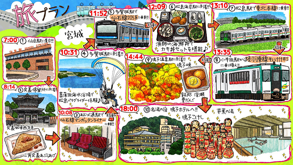 サンドさんのお墨付きなら間違いないですね。三角あぶらあげ、食べてみたい!松島では船からカモメに餌をあげて…と思ったら自分で空を飛んでしまうとは!体重は気にしないといけませんねぇ。そしてゆっくりと走ってくれる列車がうれしい。鳴子峡の紅葉、見事でした!それにしても…。同級生がこけしにこめたメッセージ、気になるなぁ笑