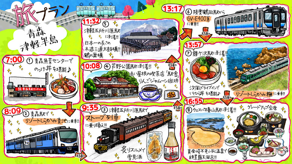 “のっけ丼”、楽しくて美味しいですよね。新鮮な魚介類の味はもちろん、地元の方々とお話しするのが本当に楽しい。そのむかし、年に一度の青森出張のときに毎回会いに行ったりんご屋のおばちゃんを思い出しました。そしてストーブ列車、一度乗車したいですね。車内に漂うスルメのいいにおいを体験したい!