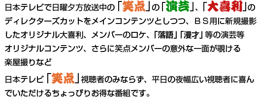 - 6代目の司会に消去法で選ばれた。落語家としての評価は素晴らしく、若くして芸術祭大賞をはじめ、数々の賞を受賞してきた。本人の目標は「80才になった時、ものすごく面白い噺家になっていたい」。面白い噺家になるために、落語芸術協会の会長を引き受け、長年親しまれてきた永遠の独身キャラも捨て、ついに結婚!更なる高みを目指す司会者が、メンバー達をどうさばいていくか見ものである。