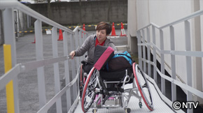 自宅から40分かけて保育園に。保育園から、さらに1時間かけてやってきたのは東京・江東区にある体育館。去年完成した日本初となるパラバドミントン専用の体育館。2020年に向け、着々と環境が整いつつあるパラバドミントン。車いすのクラスは腹筋の機能などの障がいの程度によって2つのクラスに分かれている。山崎選手がプレーするのは腹筋が使えるWH2のクラス。使用するコートは健常者の半分。ネットに近い黒い部分はアウト。打つ範囲が狭くなるため、よりコントロールが求められる。